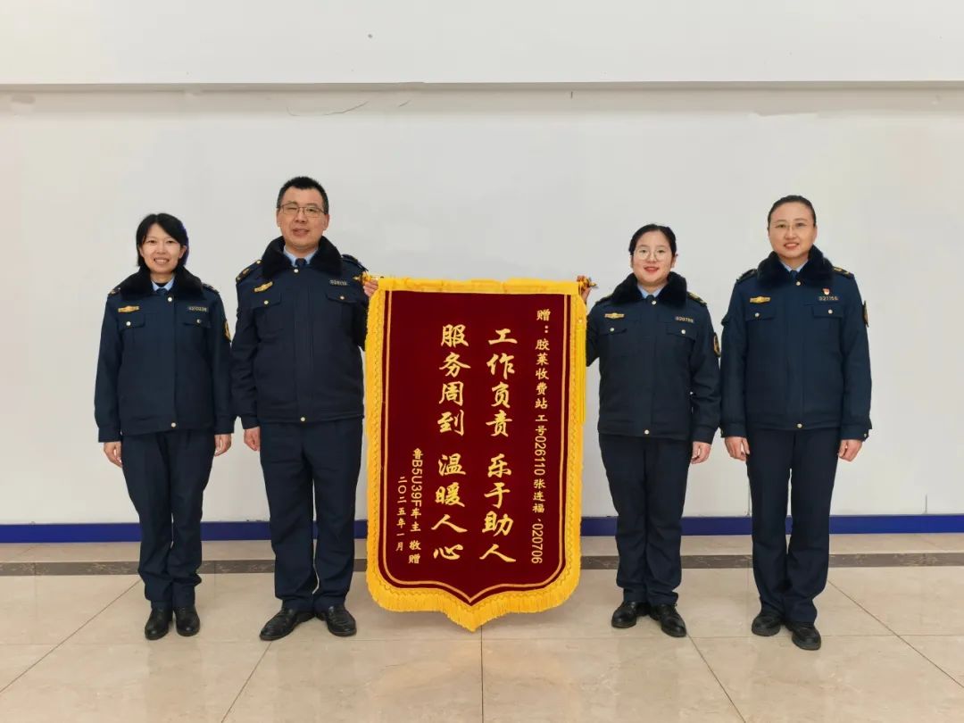 近日,青岛高速收到了一面从河北省寄来的锦旗。这面锦旗背后,是一段发生在1月20日的温暖故事。当天上午,胶莱收费站出口车辆正在有序通行。一辆白色小轿车突然发出一声巨响,车辆爆胎后剧烈摇晃,停在了车道内。车内司乘惊慌失措,年幼的孩子也吓得大哭起来。当班班长李倩倩迅速赶到车旁,一边轻声安抚着惊慌的司机和哭泣的孩子,一边向上报告情况。随后,与同事合力将车推到出口外广场的安全位置,摆好锥形帽,做好安全防护措施。紧接着,他们又从后备箱拿出千斤顶和扳手,熟练地帮助更换备用轮胎。车辆修好后,司机激动得表达着感谢。之后,还拨打了青岛高速96586服务热线,再次表达心中的感激。因为已经回到老家,司机无法亲自送锦旗,便选择用邮寄的方式,传递这份真挚的谢意。