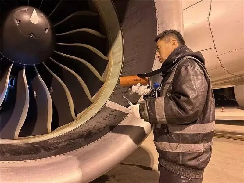 (图为维修人员在做航前绕机检查工作)