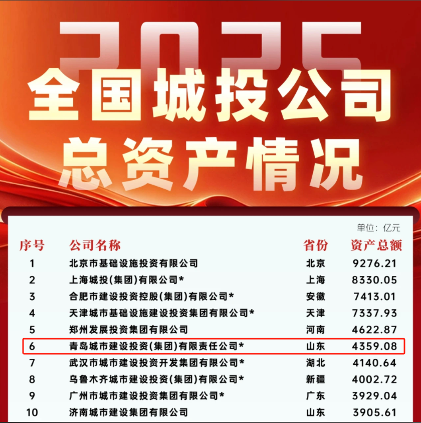青岛城投集团以4359.08亿元资产总额和469.76亿元营业收入荣登全国城投公司总资产榜第六名、营业收入榜第五名、