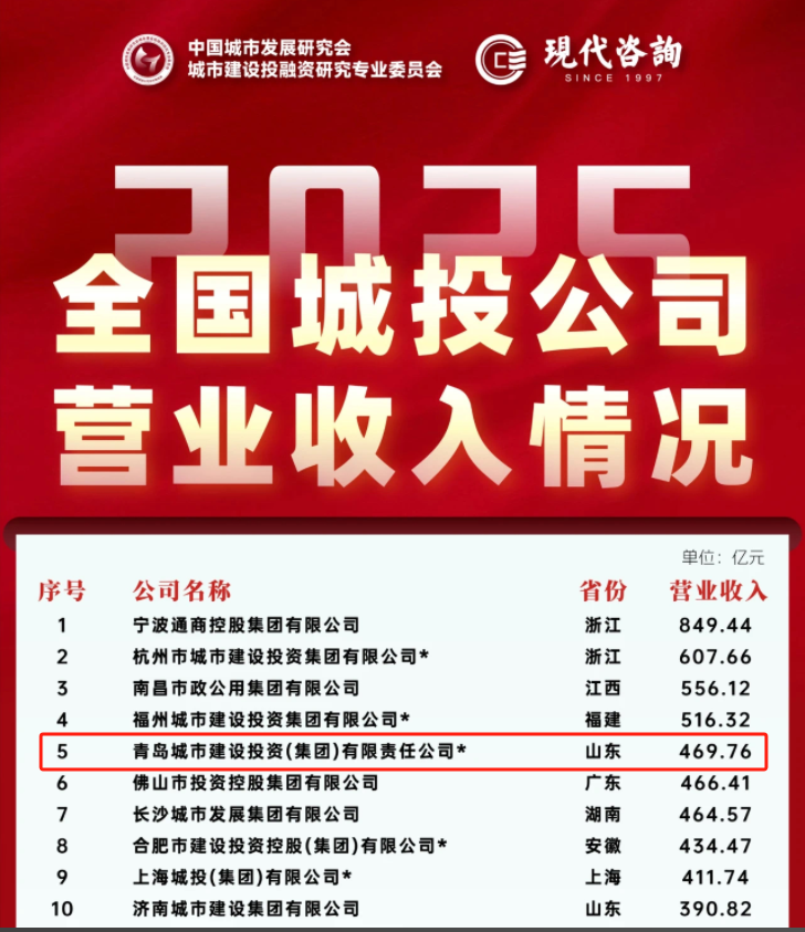 青岛城投荣登全国城投公司收入榜第5名