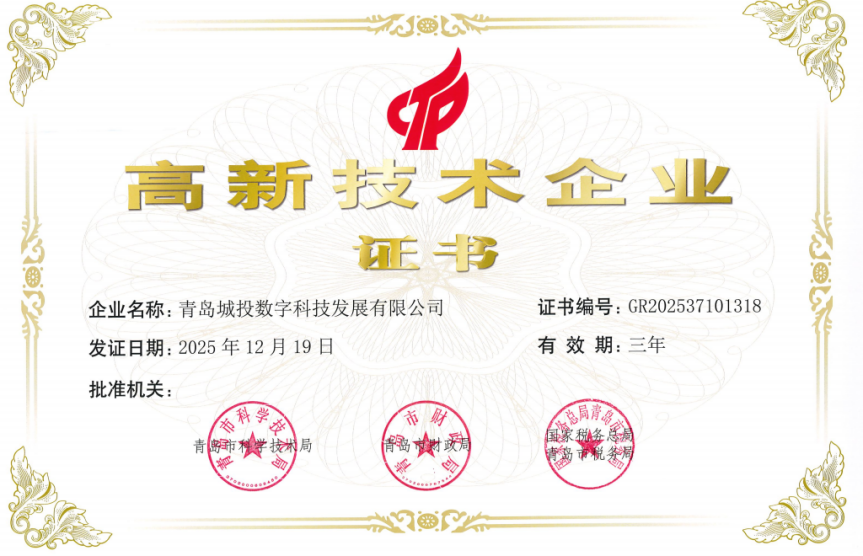 近期,青岛城投集团旗下数科公司正式通过高新技术企业认定,获得由市科学技术局、市财政局、市税务局联合颁发的“高新技术企业”证书,标志着数科公司在技术研发、成果转化及核心自主知识产权等方面获得行业主管部门认可。