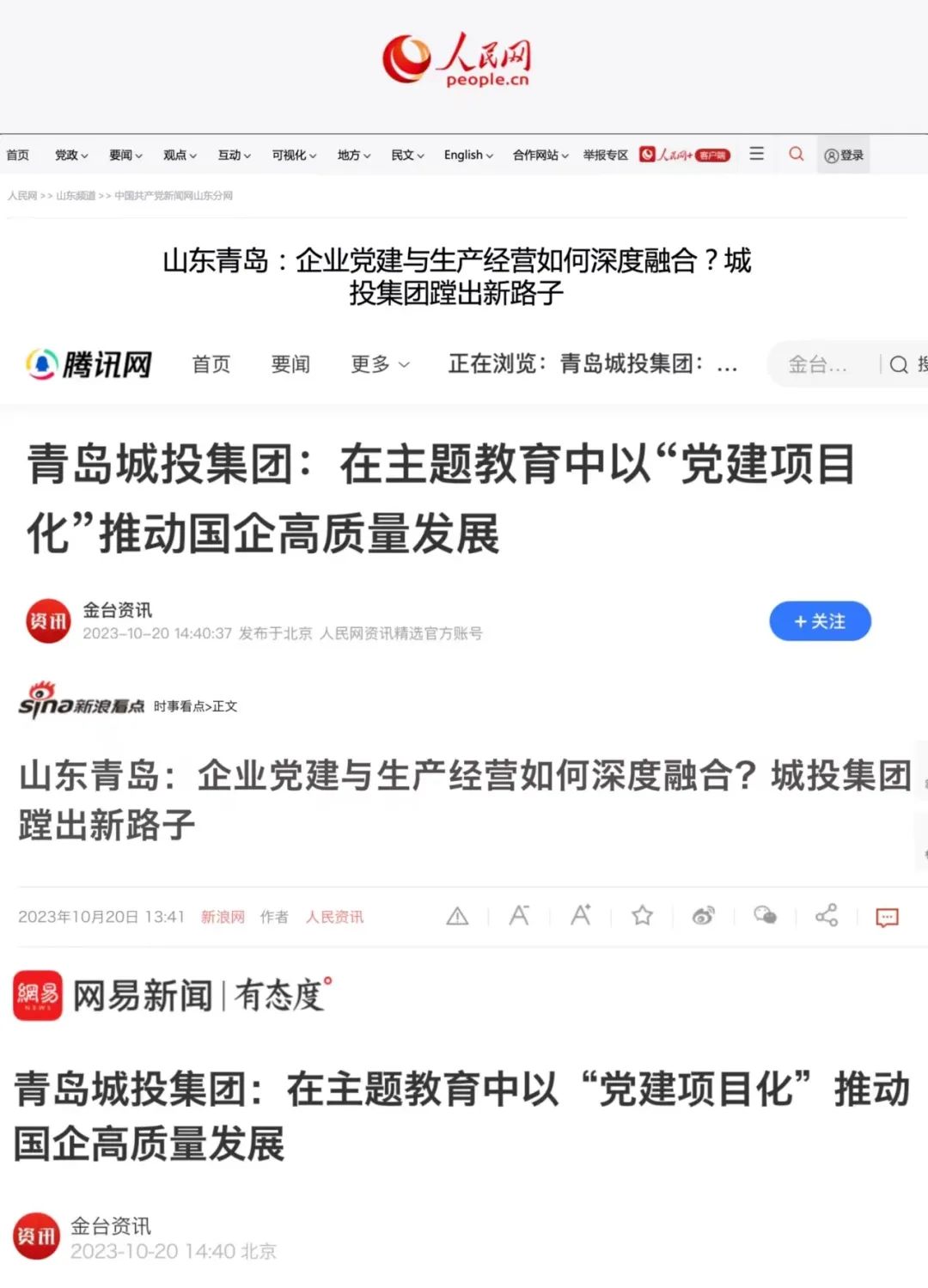 10月20日,人民日报旗下人民网在中国共产党新闻网、人民网港澳台版、金台资讯、腾讯网、网易新闻、新浪网等知名媒体平台集中报道了《在主题教育中以“党建项目化”推动国企高质量发展》《企业党建与生产经营如何深度融合?城投集团蹚出新路子》两篇文章16次。青岛城投集团“党建项目化”的创新做法,为国有企业破解党建经营“两张皮”难题给出“城投答案”,在互联网引发热烈反响。