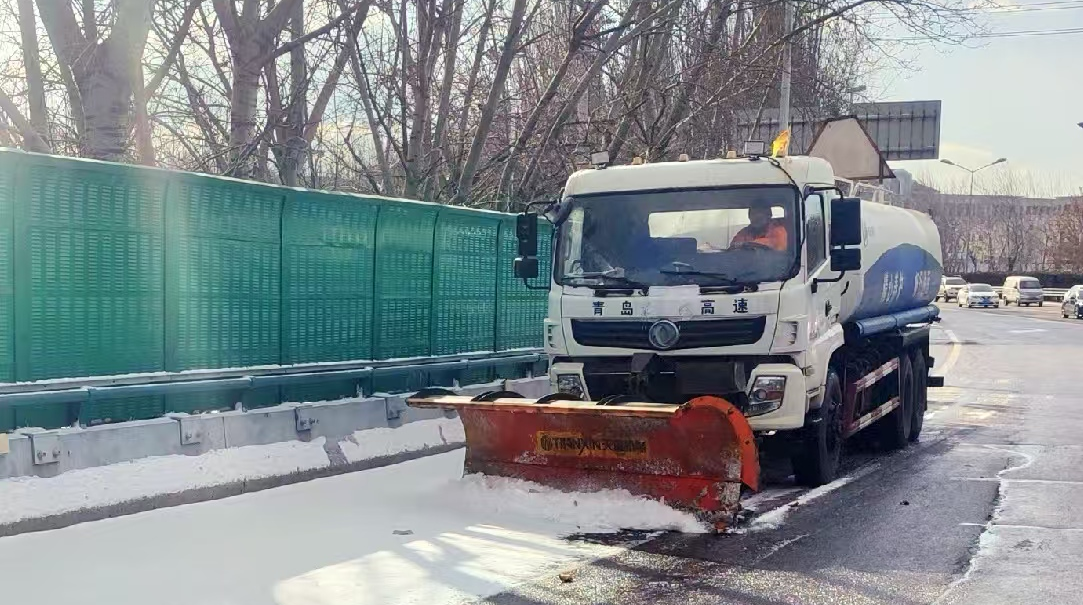 1月8日至9日,青岛市中北部地区及市区东部范围内出现冷流降雪,青岛城投集团旗下青岛高速所辖青银高速、青新高速、沈海高速、龙青高速等多个交通主干道被雪覆盖。此次降雪具有分散性高、短时降雪量大的特点,为有效应对可能出现的积雪及结冰问题,青岛高速以雪为令,第一时间启动除雪防滑应急预案,科学制定除雪防滑措施,多措并举保障通行安全,打响2025年除雪保畅“第一仗”。(图为推雪铲车在青银高速流亭立交匝道对应急车道进