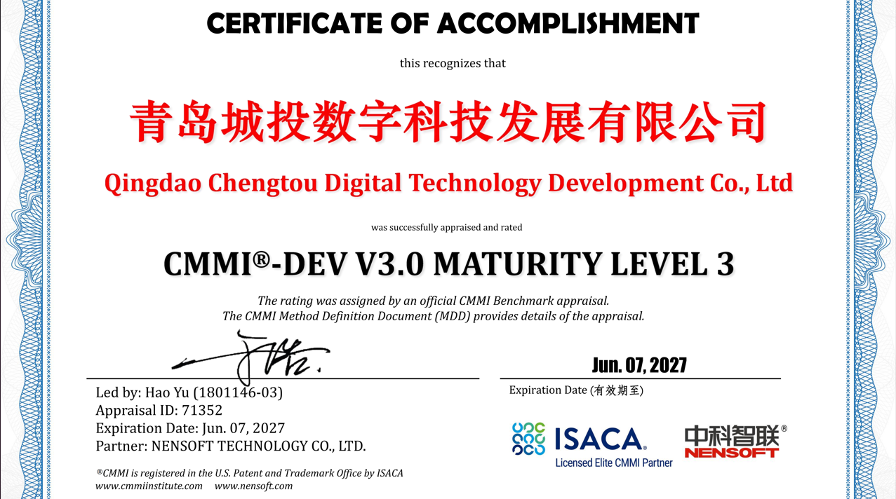 近日,青岛城投集团旗下数科公司凭借在项目管理及信息技术服务领域的卓越表现,顺利获得“CMMI 3级”与“ITSS 3级”认证,标志着数科公司在软件研发管理与信息技术服务标准化方面迈上了新的台阶。(图为CMMI3级证书)CMMI(Capability Maturity Model Integration,能力成熟度模型集成等级)是全球软件业最权威的评估体系之一,旨在帮助企业提升软件产品开发及过程管理的成熟度。获取了该项资质,表明数科公司在项目策划、执行监