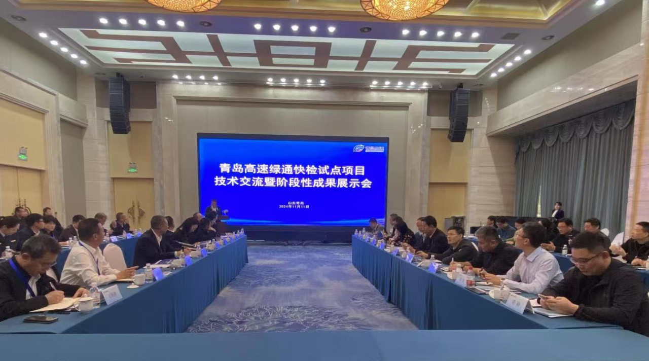 11月11日,由青岛城投集团旗下青岛高速集团主办的全省首个高速公路绿通快检试点项目技术交流暨阶段性成果展示会议在青岛顺利召开,标志着山东省首个高速公路绿通快检试点项目在青岛落地。中国交通运输协会交旅融合发展分会会长、交通运输部综合规划司原副司长于胜英主持会议,交通运输部机关服务局原工会主席周宝义出席会议。交通运输部路网监测与应急处置中心、环境保护中心、省交通运输厅相关领导,市交通运输局、青岛高速集团