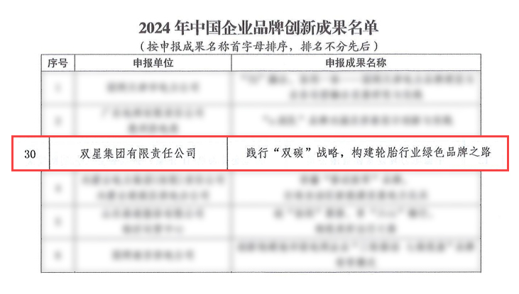 近日,中国质量协会发布“2024年中国企业品牌创新成果”名单,双星集团《践行“双碳”战略,构建轮胎行业绿色品牌之路》荣获“中国企业品牌创新成果奖”,成为轮胎行业唯一获此殊荣的企业。中国企业品牌创新成果根据团体标准《品牌创新成果评价指南》相关要求,从品牌战略创新、品牌传播创新、品牌形象设计创新、品牌数字化创新、品牌管理创新五个方面进行评价,经行业协会组织推荐、合规性审查、专家评审、终审等环节,在全国范