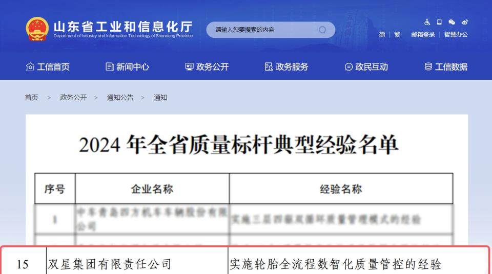 近日,山东省工业和信息化厅公布2024年全省质量标杆典型经验名单,双星集团“实施轮胎全流程数智化质量管控的经验”案例成功入选,成为轮胎行业唯一入选企业,彰显了双星在数智化质量管理中的示范引领作用。(图为2024年全省质量标杆典型经验名单)为贯彻落实省委、省政府《关于聚力推动工业经济高质量发展十大行动的意见》部署要求,加快提升工业品质量品牌,加强质量支撑,推动制造业高质量发展,省工业和信息化厅组织开展了202