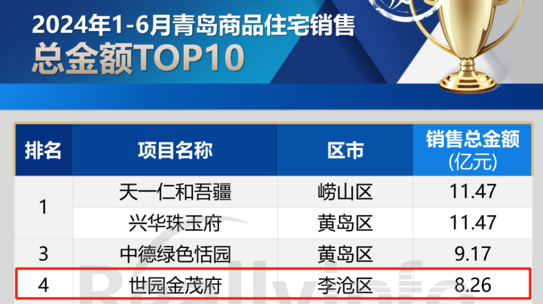近日,锐理数据发布“青岛房市年中榜”,青岛城投集团世园·金茂府以8.26亿销售总金额荣登青岛市2024上半年网签金额第四名,稳居李沧区第一名。