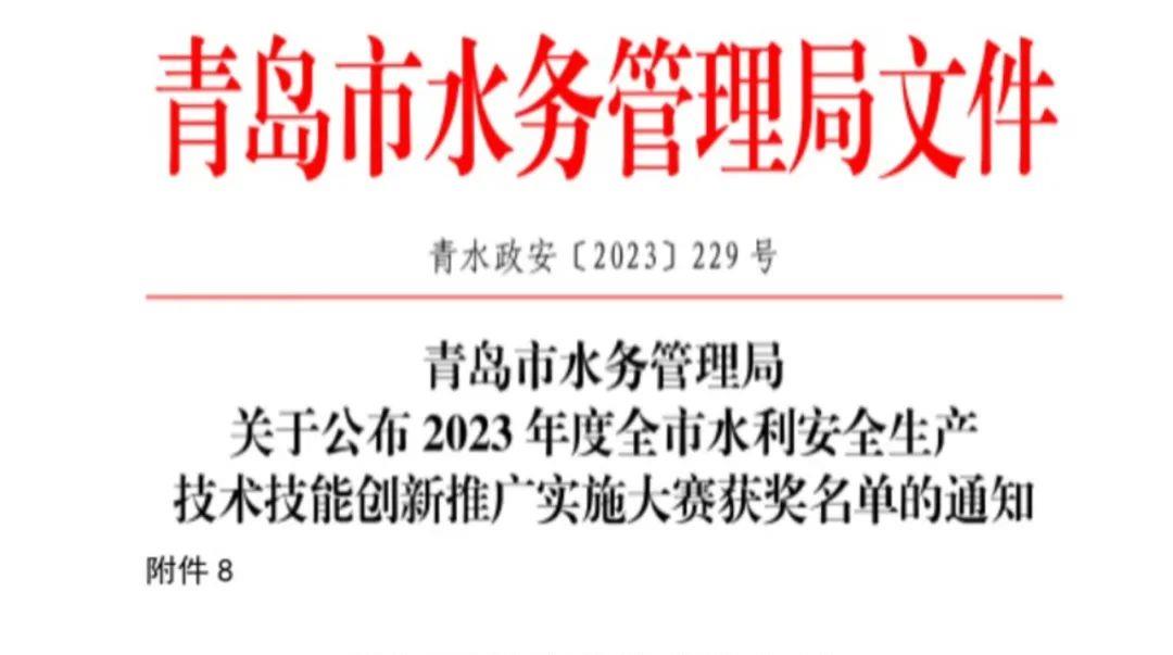 近日,青岛市水务管理局印发《关于公布2023年度全市水利安全生产技术技能创新推广实施大赛获奖名单的通知》,青岛城投集团官路水库公司荣获“2023年度全市水利安全生产技术技能创新推广实施大赛特别贡献奖”。(图为部分获奖名单)水利安全生产技术技能创新推广实施大赛是深入贯彻落实习近平总书记“十六字”治水思路和关于治水兴水重要讲话批示指示精神的具体举措;是推动《山东省黄河流域生态保护和高质量发展规划》全面实施、
