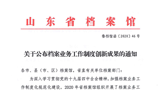 2020年12月22日,山东省档案馆《关于公布档案业务工作制度创新成果的通知》(鲁档馆字〔2020〕46号)正式发布,集团所属5家单位荣获山东省档案业务工作制度创新成果三等奖,分别是青岛城投文化产业有限公司、青岛(莱西)城乡社区建设投资有限公司、青岛城投资产管理有限公司、青岛城乡建设小额贷款有限公司、青岛城投地产投资控股(集团)有限公司。