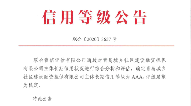 9月17日,联合资信评估有限公司(下称“联合资信”)发布信用等级公告(联合〔2020〕3657号),通过对青岛城乡社区建设融资担保有限公司(下称“城乡担保”)主体长期信用状况进行综合分析和评估,确定公司主体长期信用等级为AAA,评级展望为稳定。金控集团城乡担保公司成为目前山东省首家AAA融资担保机构。