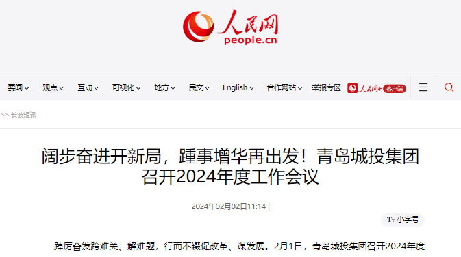 人民网:阔步奋进开新局,踵事增华再出发!青岛城投集团召开2024年度工作会议